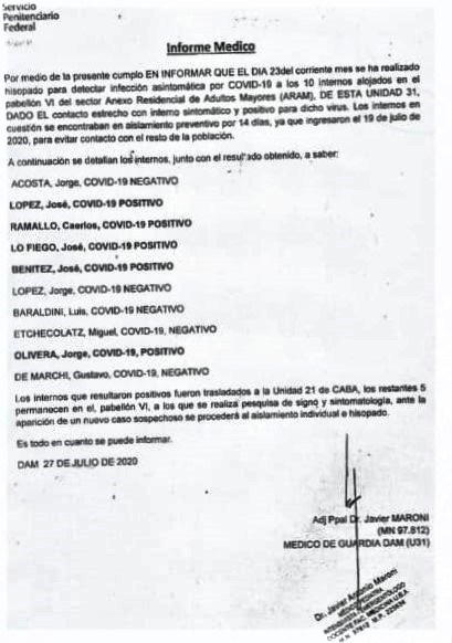Acosta fue el jefe del grupo de tareas 3.3.2 que con base en la ESMA secuestró, torturó y desapareció a miles de personas. Estaba cumpliendo aislamiento preventivo desde el 19 de julio, por el contacto estrecho con otro genocida condenado, con que el que convive en uno de los pabellones especiales de la Unidad carcelaria 31 de Ezeiza, especialmente acondicionado para quienes participaron en el Terrorismo de Estado imperante en el país durante la última dictadura cívico-militar-eclesiástica hasta 1983. En esa unidad, las condiciones distan de tener el hacinamiento en que viven las y los presos en el resto de las cárceles del país. El 27 de julio, el hisopado realizado a Acosta resultó negativo, al igual que el de Miguel Etchecolatz, otro alto jerarca del autodenominado Proceso de Reorganización Nacional. Sin embargo, tras un nuevo testeo, ambos dieron positivo ayer. El genocida Etchecolatz también volvió a intentar que le otorguen el beneficio, pero resulta difícil pensar que los varios tribunales que lo condenaron, coincidan en dárselo.