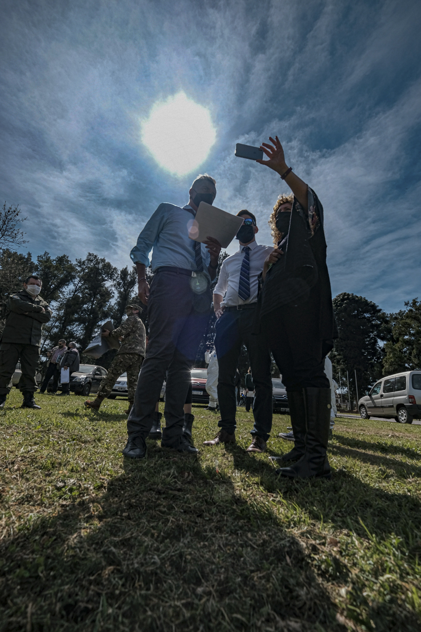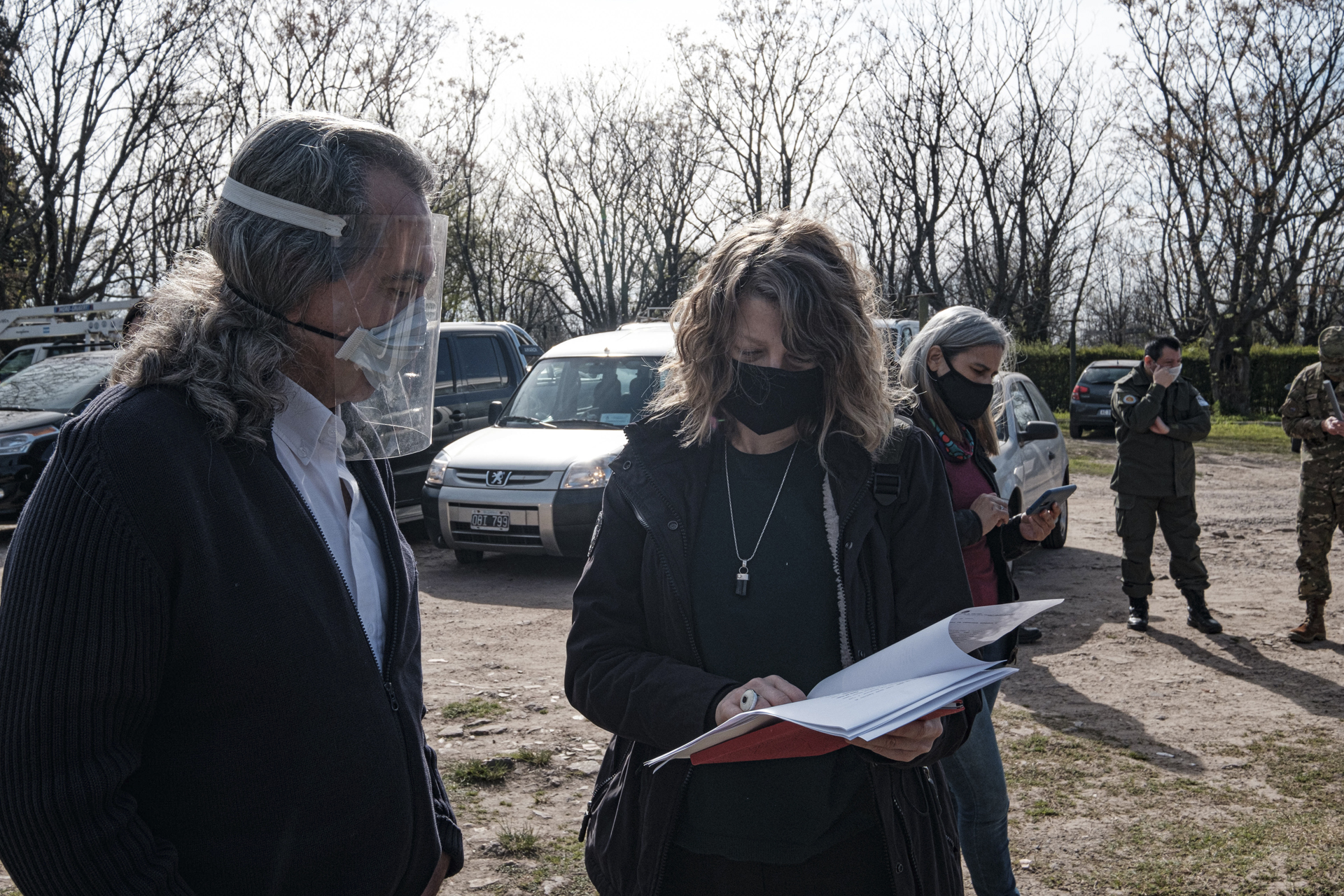 | 👆 La jueza María Claudia Morgese Martín no participó de la visita pero en distintos momentos, los otros dos miembros del tribunal se comunicaron con ella por videollamada. Uno de ellos fue en la entrada del Polígono de Tiro, con el sonido de los disparos como telón de fondo. Dentro del predio donde se encuentra el polígono, otros disparos habrían fusilado hace 40 años, por lo menos, al Pato Zucker, a Federico Frías y a otras dos personas secuestradas, según señaló en su declaración el ex cabo Nélson González. El ex militar dijo ante los jueces que de la macabra ceremonia participaron algunos jefes del Ejército, entre los que estaba Cristino Nicolaides, y también “Sixto Ibáñez, el Mayor Surraco (de artillería, oficial de inteligencia) y el sargento primero Taborda”. 📷 Gustavo Molfino/El Diario del Juicio |