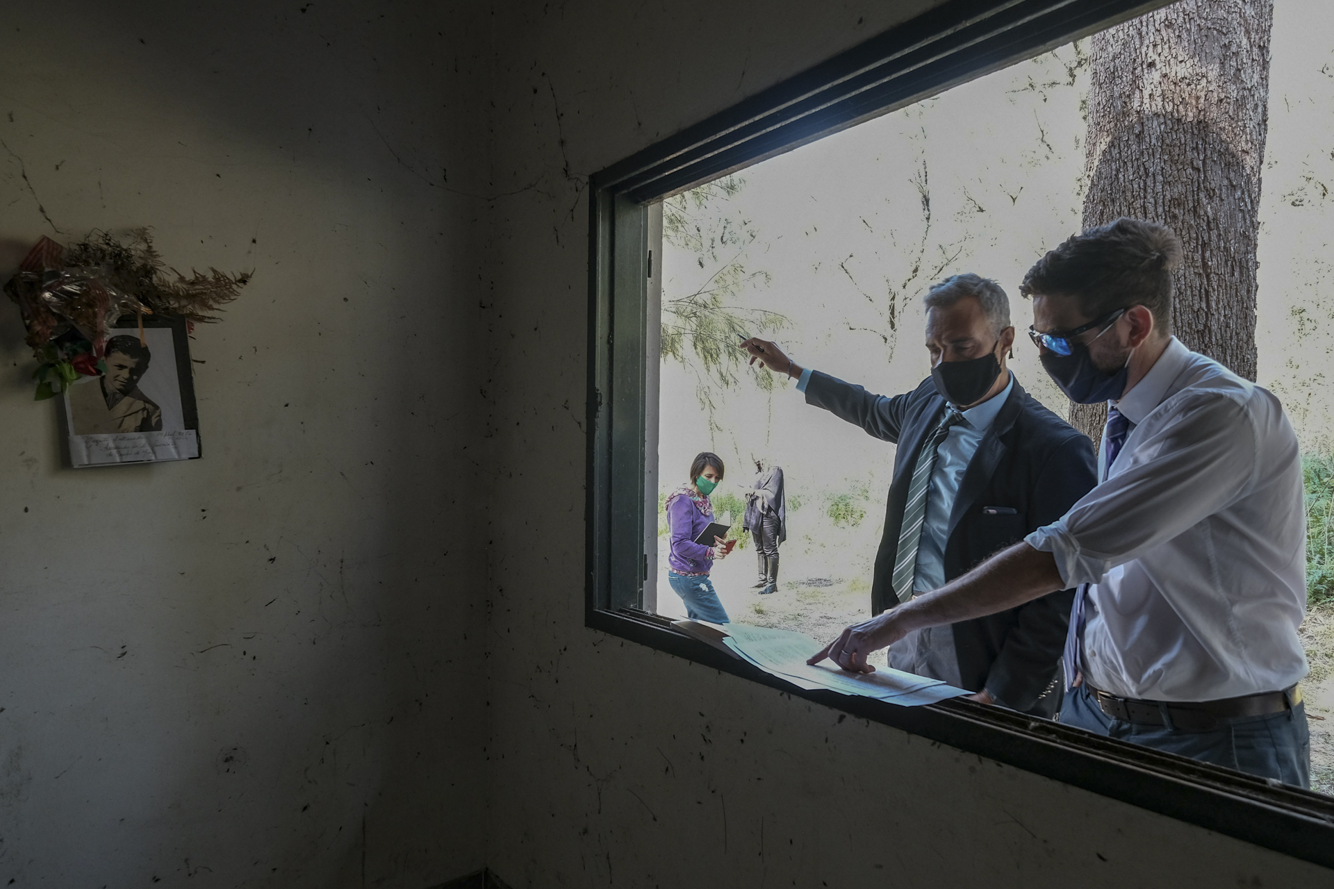 | 👆 Los jueces Matías Mancini, con camisa blanca arremangada, y Esteban Rodríguez Eggers, fueron guiados por el Mayor del Ejército Nicolás Liguori. La querella de Pablo Llonto había solicitado que las indicaciones pudieran ser realizadas por Stella Segado, testigo de este juicio, y Marcelo Castillo, quien coordinó el grupo del Equipo Argentino de Antropología Forense que trabajó en Campo de Mayo, pero los jueces denegaron el pedido, con el argumento de que deberían haber sido testimoniales en el marco de la visita, que técnicamente es una audiencia más dentro del juicio. 📷 Gustavo Molfino/El Diario del Juicio 👆 Lo más cerca que se llegó del centro clandestino conocido como El Campito, ya demolido, fueron dos construcciones posteriores a la dictadura. En una de ellas, mientras los jueces revisan el mapa, se observa una de las pocas referencias en todo el predio a lo sucedido en Campo de Mayo. Es una foto de Floreal Avellaneda, El Negrito, un militante de la Federación Juvenil Comunista, secuestrado cuando tenía 16 años. Su cuerpo apareció en la costa ribereña uruguaya. Las pocas señalizaciones quizá tengan como explicación que el predio, de 8 mil hectáreas, continúa en manos de la misma fuerza que fue parte del genocidio, a diferencia de tantos otros ex centros de torturas y desapariciones que se convirtieron en sitios de memoria.