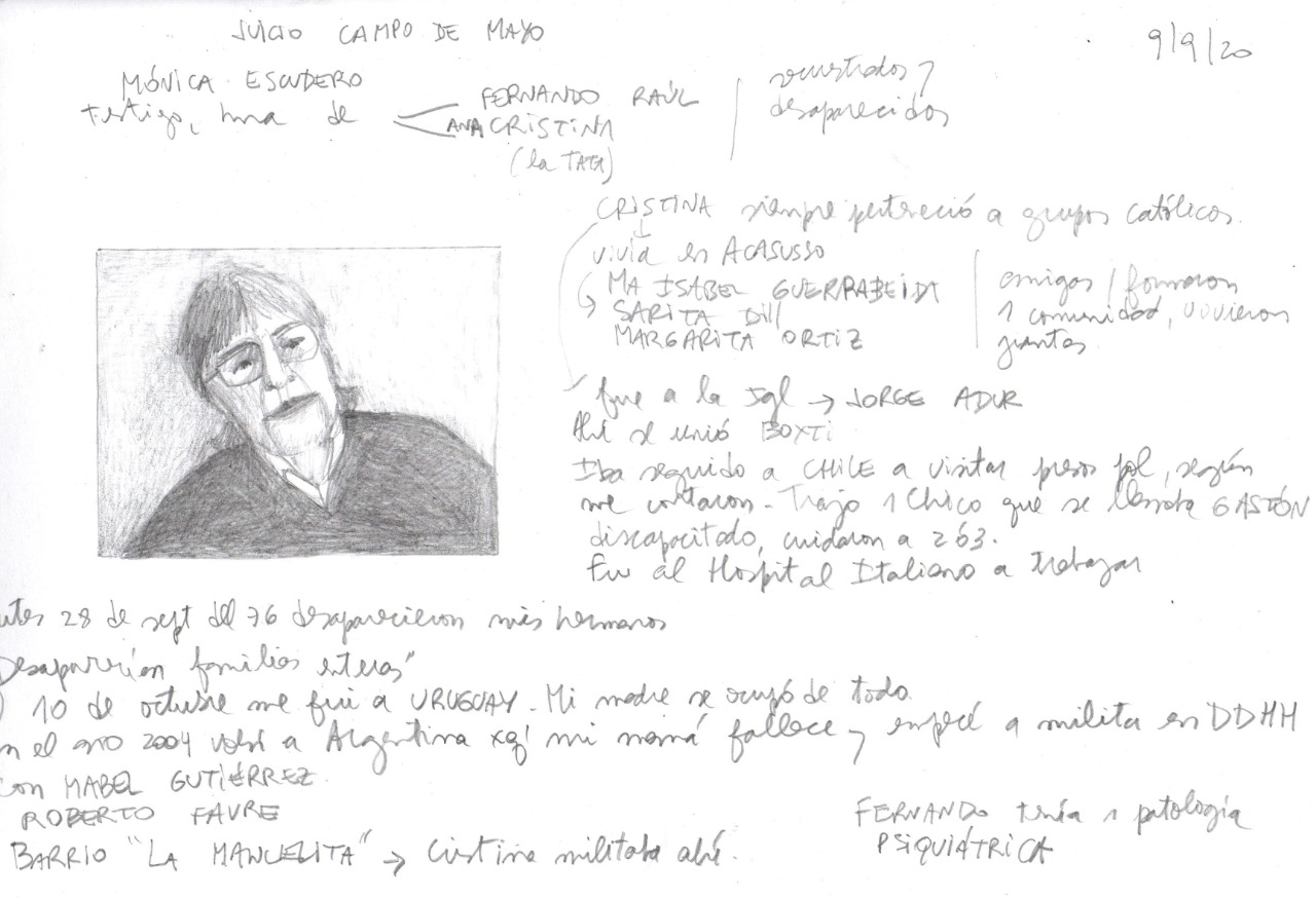 En el cierre de la jornada, Mónica Escudero brindó testimonio por las desapariciones de su hermana, Cristina, y su hermano, Fernando. Fueron desaparecidos el 28 de septiembre de 1976. La familia tenía un local de antigüedades en Martínez, sobre Avenida del Libertador. Los militares llegaron buscando a Cristina. Ella no estaba en el local, y se llevaron a Fernando. Fueron hasta donde vivía su hermana: “Revolvieron toda la casa y se llevaron todo lo que pudieron”, contó Mónica.