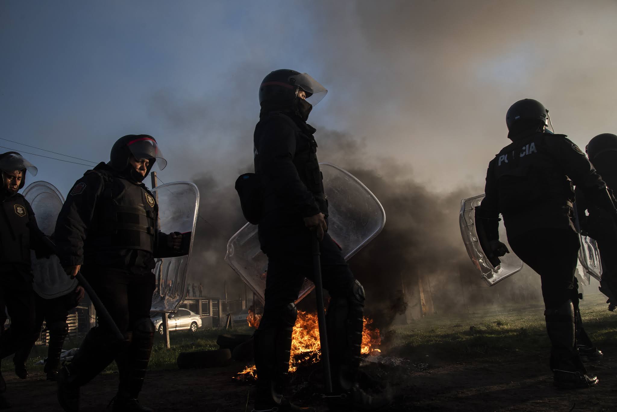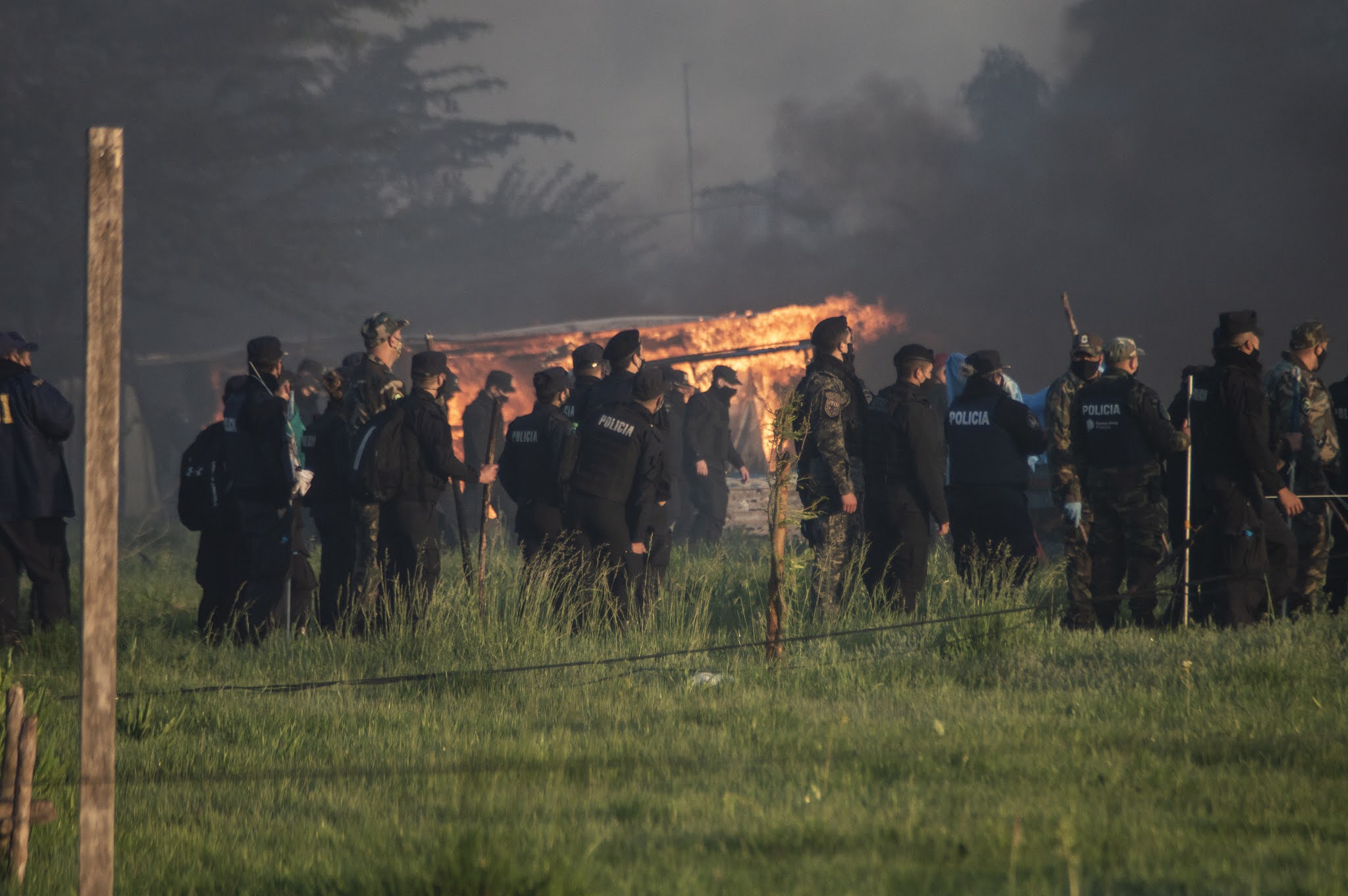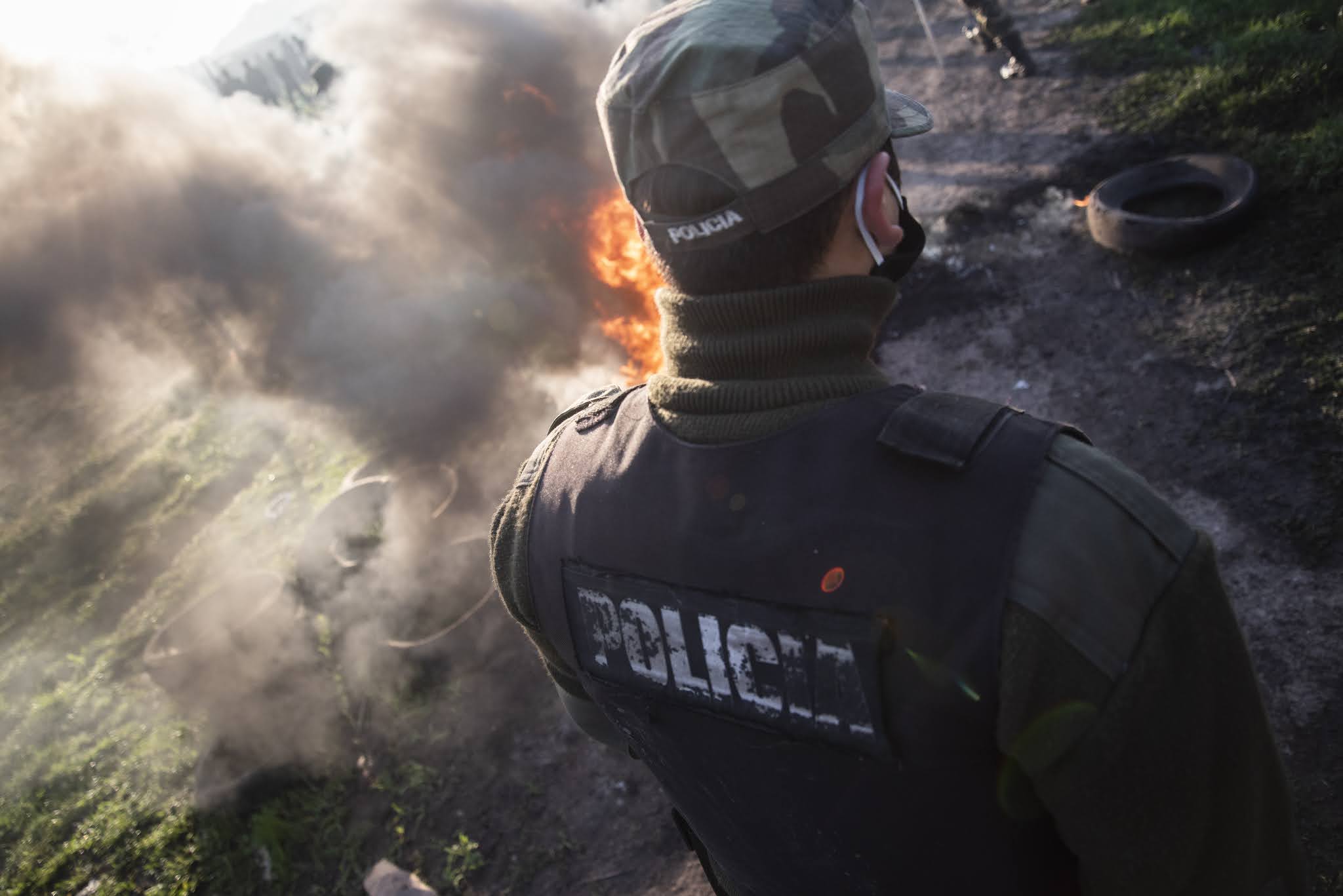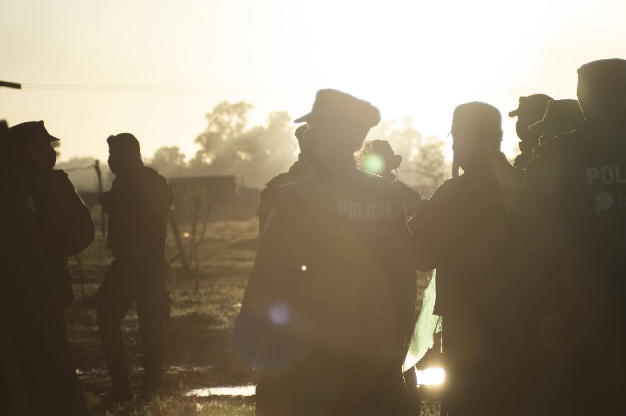 Apenas el cielo alumbró las chapas, carpas y casillas de madera en Guernica, 4000 integrantes de las fuerzas policiales de la Provincia de Buenos Aires al comando del ministro de Seguridad Sergio Berni, ingresaron a desalojar violentamente el asentamiento. Solo habían pasado horas desde la última reunión entre las diferentes partes (intendencia, gobierno provincial, organizaciones sociales y políticas, abogadas/os y delegadas/os) que parecía cerrar un acuerdo. Sin embargo, cuando quienes participaban de la toma anunciaron que aceptaban firmar en las condiciones que les habían propuesto, el fiscal Juan Cruz Condomí Alcorta (quien se sacaría una selfie sonriente en medio de la represión, vaya a saber para compartir su alegría con quien) dijo que ya era tarde para acordar y que desalojaría al día siguiente a través de las fuerzas policiales. Todas las miradas se dirigieron entonces hacia Andrés «Cuervo» Larroque, el Ministro de Desarrollo de la Comunidad del gobierno de Axel Kicillof. Pero Larroque dijo que el tema ya estaba en manos de Berni. Y Berni hizo lo que había anunciado que deseaba hacer. La suerte de las 1450 familias ya estaba echada. En medio de la represión, Radio La Retaguardia realizó una emisión especial del matutino Hasta que vuelvan los abrazos. Por allí pasaron las voces de Nora Cortiñas, Lily Galeano de HIJOS La Matanza, Laura Taffetani de la Gremial de Abogadas/os y la diputada porteña Alejandrina Barry. También dejó sus primeras sensaciones Agustina Salinas, la fotógrafa de La Retaguardia de quien compartimos estas fotos. (Por La Retaguardia)