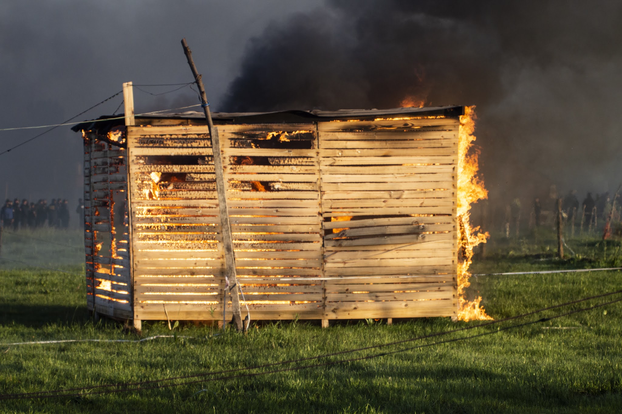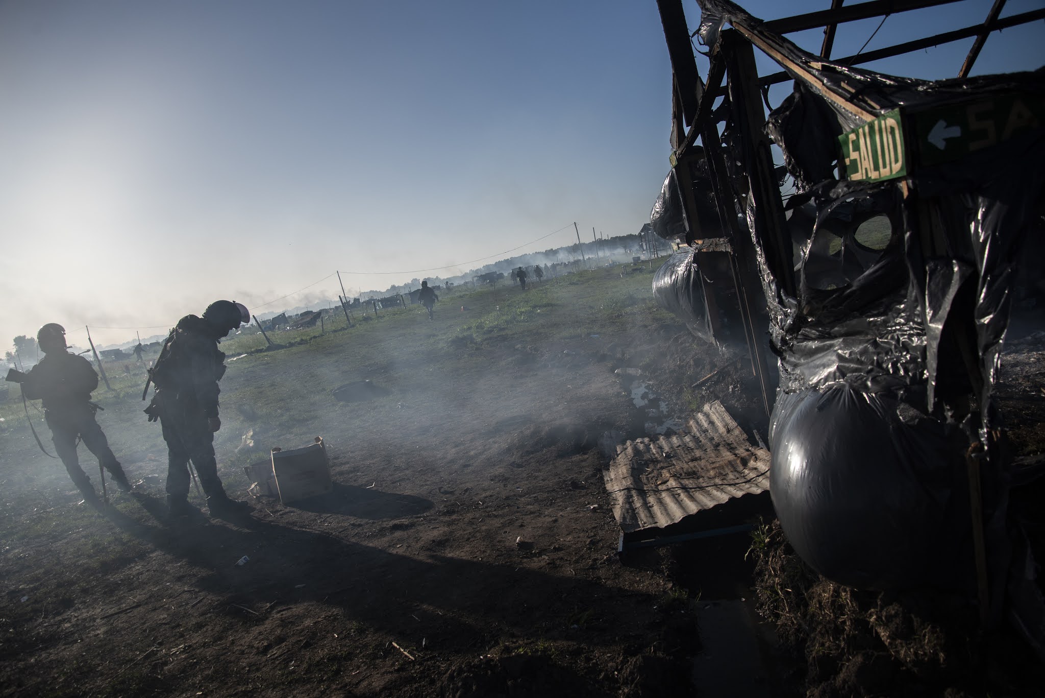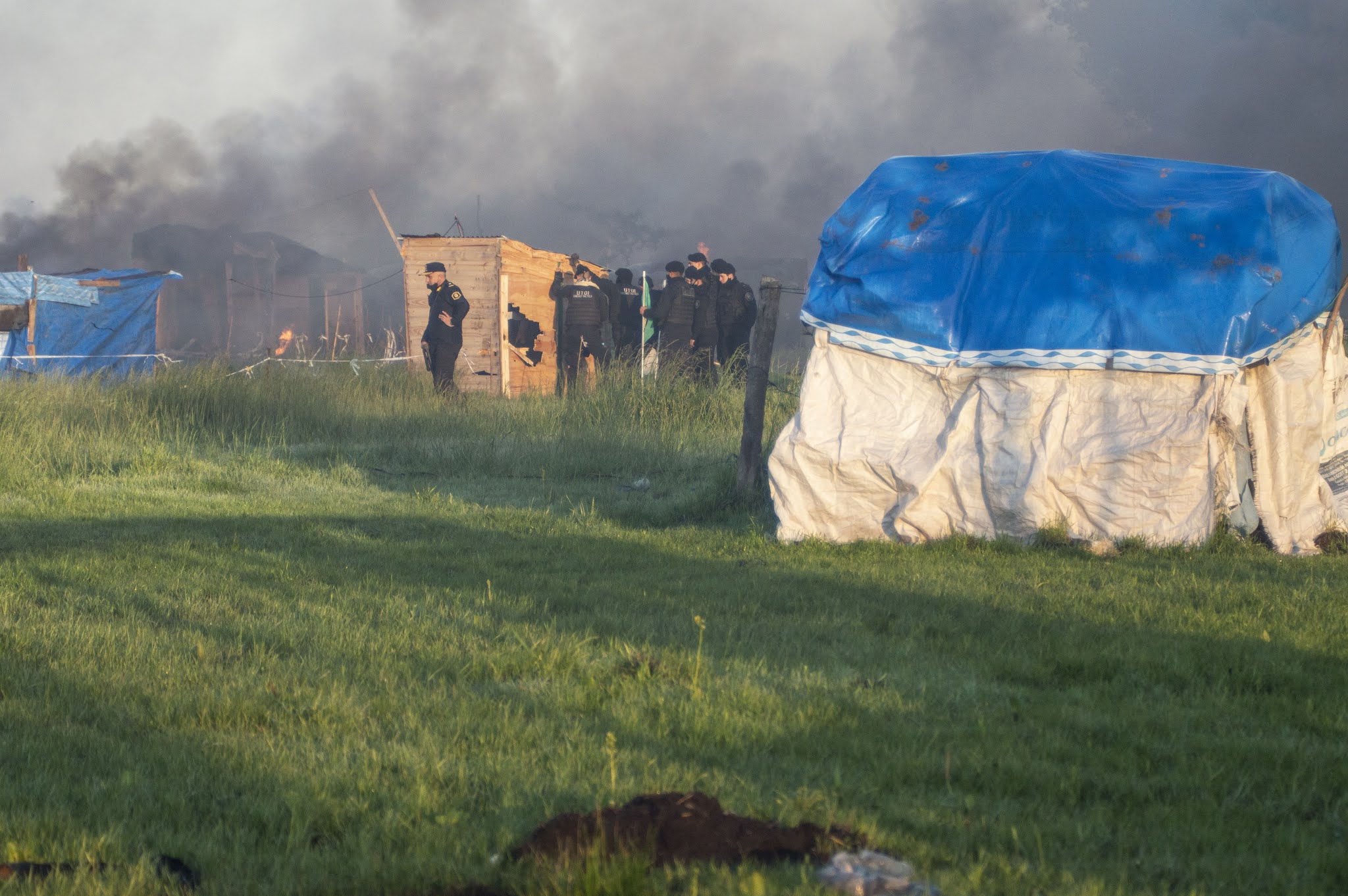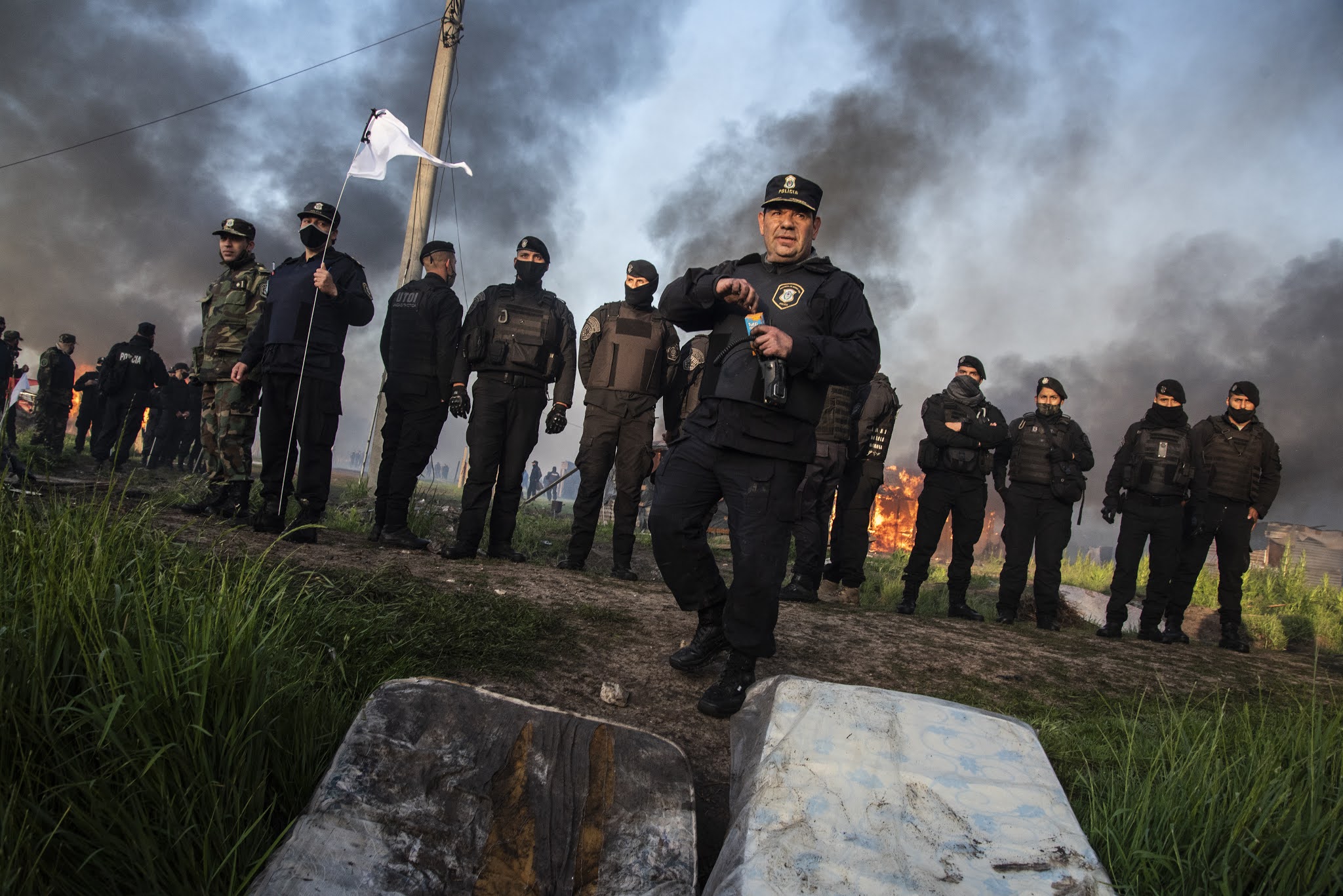 Apenas el cielo alumbró las chapas, carpas y casillas de madera en Guernica, 4000 integrantes de las fuerzas policiales de la Provincia de Buenos Aires al comando del ministro de Seguridad Sergio Berni, ingresaron a desalojar violentamente el asentamiento. Solo habían pasado horas desde la última reunión entre las diferentes partes (intendencia, gobierno provincial, organizaciones sociales y políticas, abogadas/os y delegadas/os) que parecía cerrar un acuerdo. Sin embargo, cuando quienes participaban de la toma anunciaron que aceptaban firmar en las condiciones que les habían propuesto, el fiscal Juan Cruz Condomí Alcorta (quien se sacaría una selfie sonriente en medio de la represión, vaya a saber para compartir su alegría con quien) dijo que ya era tarde para acordar y que desalojaría al día siguiente a través de las fuerzas policiales. Todas las miradas se dirigieron entonces hacia Andrés «Cuervo» Larroque, el Ministro de Desarrollo de la Comunidad del gobierno de Axel Kicillof. Pero Larroque dijo que el tema ya estaba en manos de Berni. Y Berni hizo lo que había anunciado que deseaba hacer. La suerte de las 1450 familias ya estaba echada. En medio de la represión, Radio La Retaguardia realizó una emisión especial del matutino Hasta que vuelvan los abrazos. Por allí pasaron las voces de Nora Cortiñas, Lily Galeano de HIJOS La Matanza, Laura Taffetani de la Gremial de Abogadas/os y la diputada porteña Alejandrina Barry. También dejó sus primeras sensaciones Agustina Salinas, la fotógrafa de La Retaguardia de quien compartimos estas fotos. (Por La Retaguardia)