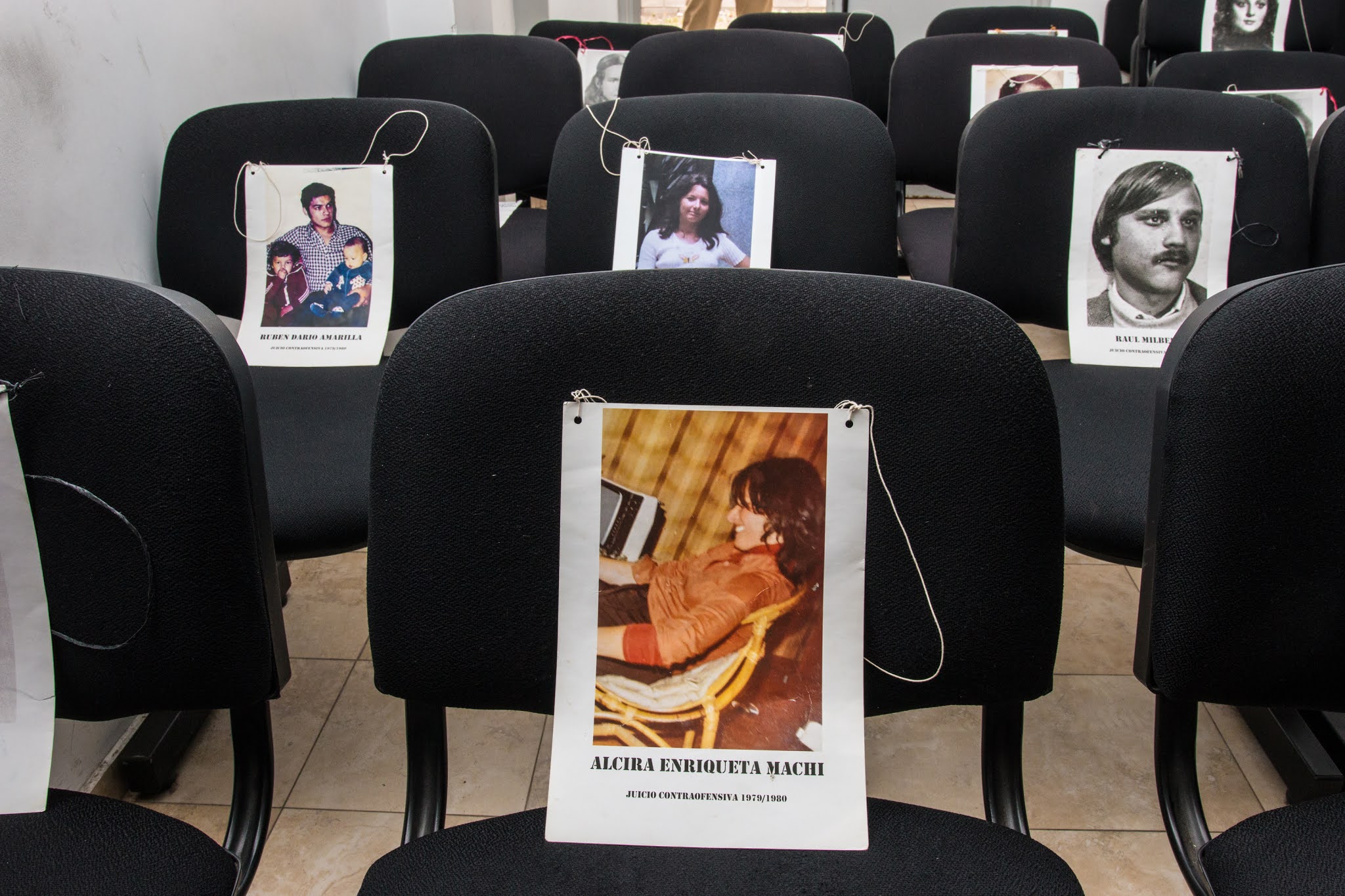 | 👆 Entre las fotos de las personas desaparecidas en las sillas, ícono visual de las audiencias durante la pandemia, se puede ver a Alcira Enriqueta Machi, quien pasó por Campo de Mayo y fue llevada a la ESMA. Allí pudo dialogar con Víctor Basterra, quien falleció hace unos meses pero alcanzó a dar el que fue su último testimonio en un juicio por crímenes de lesa humanidad. Llonto se detuvo especialmente en el aporte de Basterra a la memoria colectiva vinculada al genocidio, que también marcó a fuego este juicio, no solamente por aquel diálogo con Machi, también por el aporte documental que el sobreviviente consiguió rescatar de la ESMA. 📷 Natalia Bernades/El Diario del Juicio |