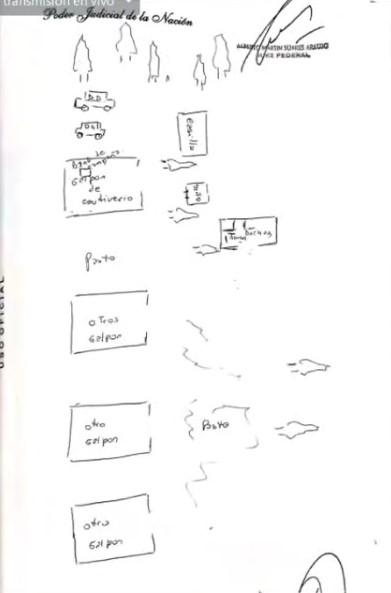Inclusive estos recorridos por fuera del galpón le permitieron, años más tarde, realizar un croquis del espacio. Moreno recuerda haber entrado por la denominada “Puerta 4” en Campo de Mayo (que fue capaz de ubicar con la forma de pequeño triángulo entre los dos árboles en el borde superior de la página) y haber salido por el lado contrario, es decir hacia la ruta. De igual manera, localiza el galpón en el que estuvo cautiva a un lado de la casilla verde en la que se detuvo al momento de la entrada. El primer rectángulo contando de arriba hacia abajo en el croquis, corresponde al galpón en el que estuvo cautiva. Este diseño bosquejado por la misma sobreviviente es exhibido durante la audiencia a pedido de Carolina Villella para que pueda ser reconocido por la testigo. Lo que en él se presenta coincide con los planos realizados de la zona d El Campito en Campo de Mayo, como pudimos ver en este juicio en la audiencia en la que se exhibió una reconstrucción digital del Centro Clandestino presentado por la antropóloga Virginia Vecchioli. Es así que Liliana Moreno dice reconocer a dicha zona como su lugar de cautiverio a pesar de no haber tenido la información al momento del secuestro.