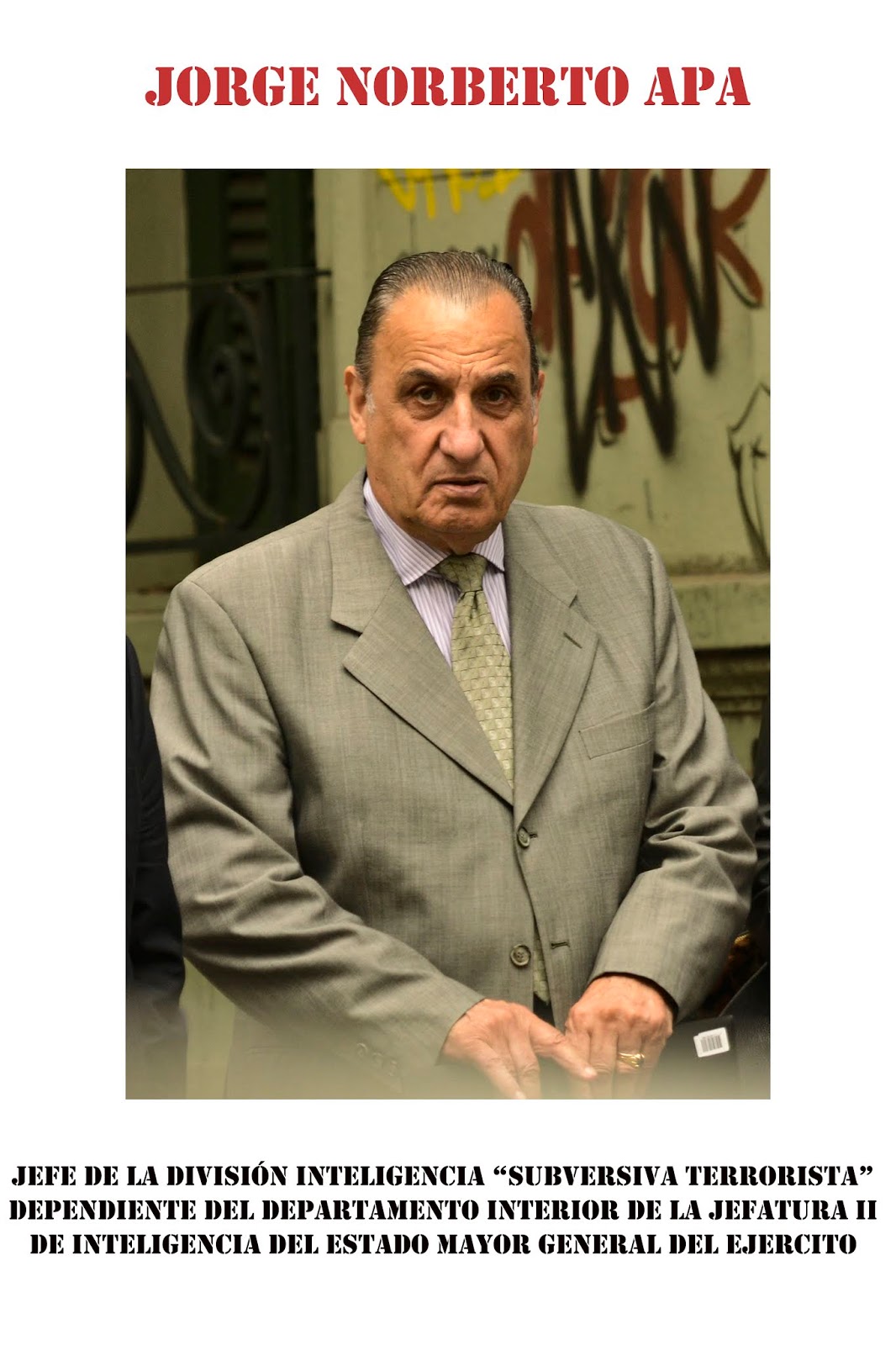 Jorge Norberto Apa, quien fuera Jefe de la División Inteligencia “Subversiva Terrorista”, dependiente del Departamento Interior de la Jefatura II de Inteligencia del Estado Mayor General del Ejército Argentino, entre el 15 de enero de 1979 y el 14 de noviembre de 1980, ya tiene otra condena por crímenes de Lesa Humanidad, y deberá ahora escuchar la sentencia que, seguramente, será condenatoria. Restará saber si conserva el beneficio de la prisión domiciliaria o si será enviado a las manos del Servicio Penitenciario Federal, examen médico mediante.
