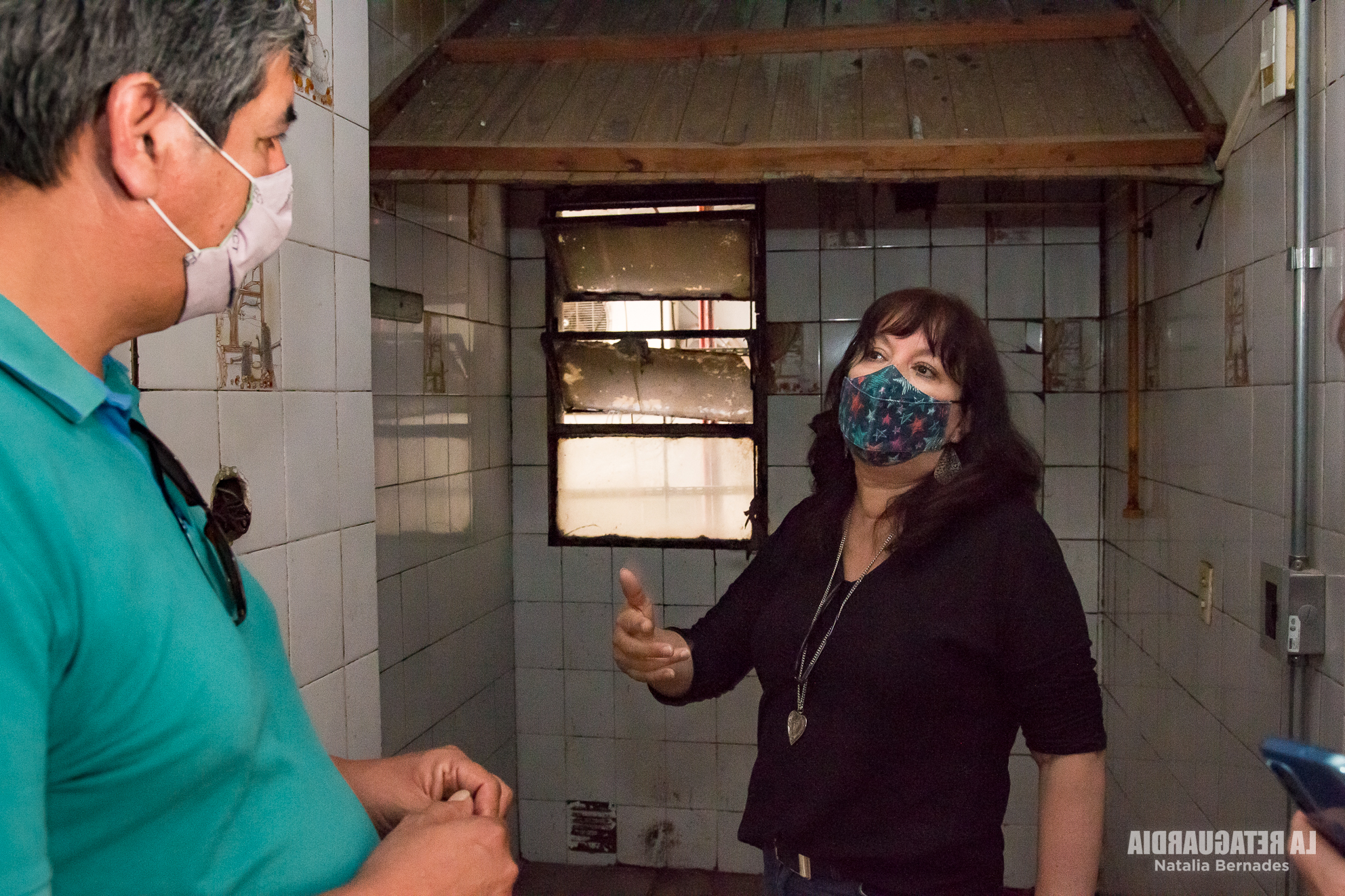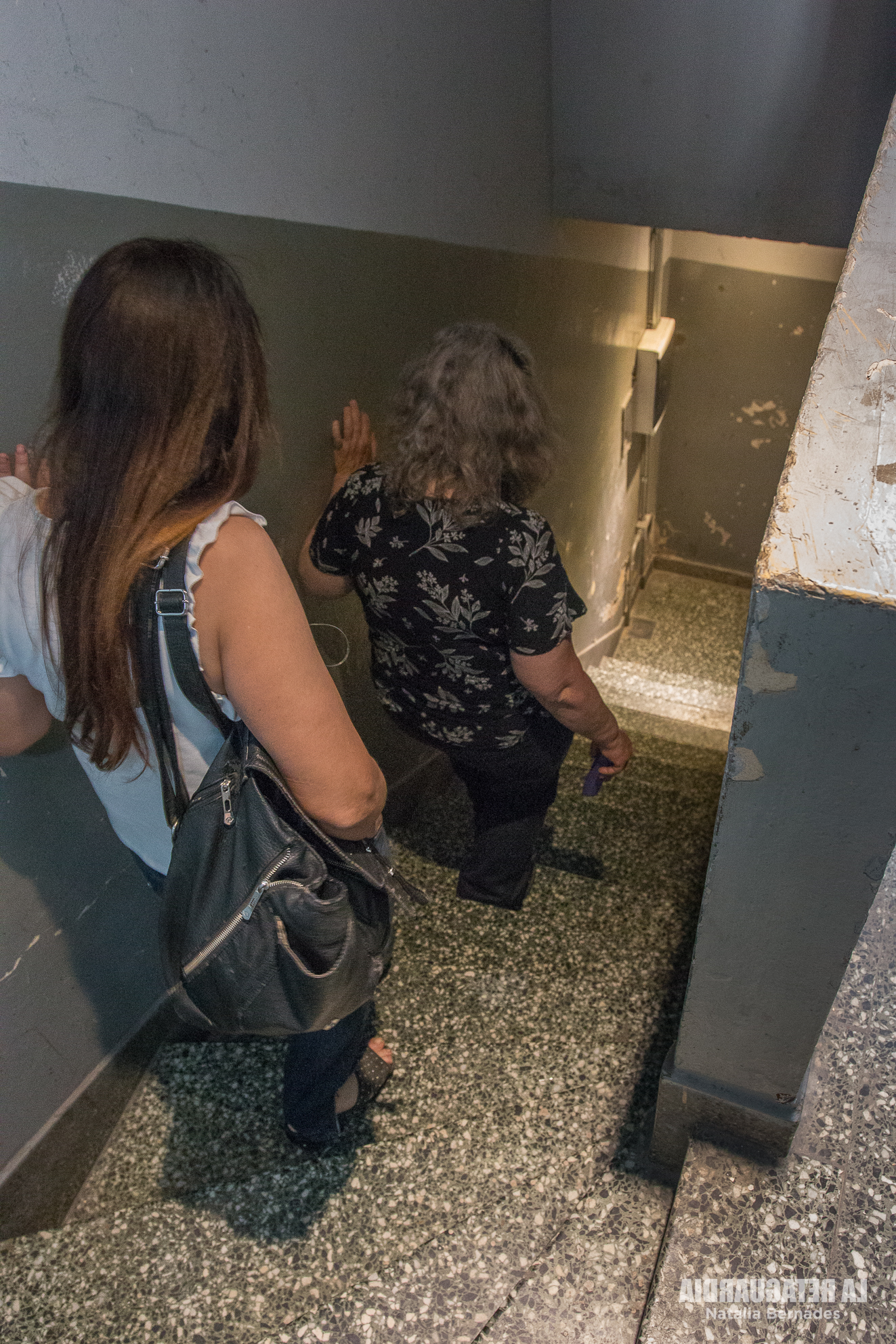 Luego de atravesar una conexión entre El chalet y el edificio, Salvatori relató que la cocina funcionó durante la dictadura y también con posterioridad. En esa zona se realizaron algunas modificaciones y cerramientos. “A mí cuando me traen en el 85, esto estaba abierto. Me entraron por ahí y me trajeron acá”, contó Miriam Arbet, mientras señalaba cada lugar. Ella es una de las tantas personas que estuvo detenida en democracia en el Pozo de Quilmes. Luego de una inundación, protagonizó en Solano una serie de cortes reclamando al intendente Eduardo Vides insumos mínimos: agua, alimentos y medicamentos para la población. “Había una salita y vinieron los servicios y me preguntaron cómo lo hacíamos y por qué habíamos cortado los puentes y eso estaba comunicado”. Miriam fue detenida junto a su beba y salió al día siguiente. A su madre, que también la llevaron por lo mismo, tardaron más en soltarla. Durante la dictadura genocida hay testimonios de torturas en ese mismo lugar. Al hacer el recorrido, entrando por El chalet y luego pasar al edificio para llegar al garaje hay que bajar por una escalera interna. La sensación de Pozo se siente en la piel, en cada paso.
