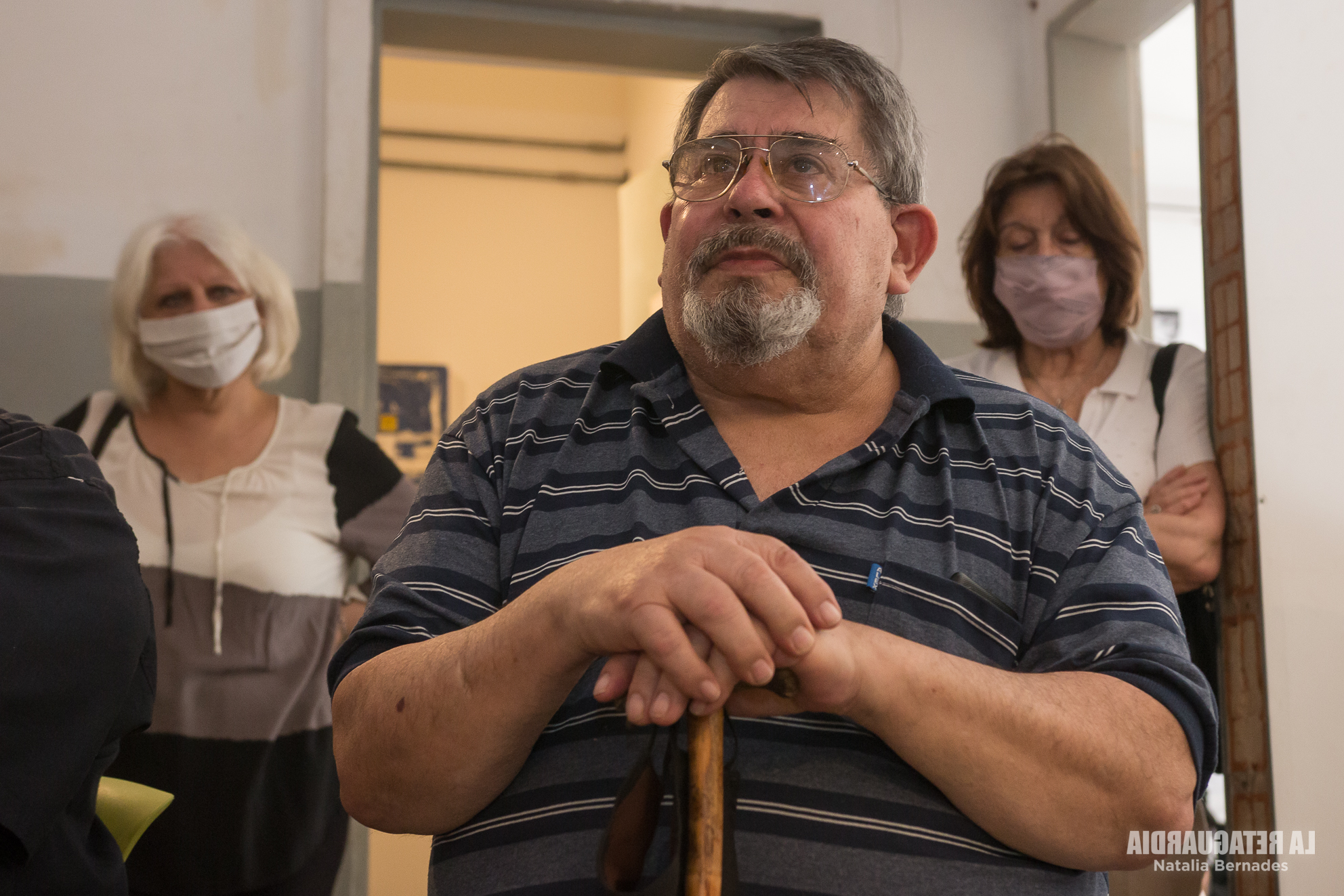 “Yo estuve acá, con mi hermano. En este calabozo”, dijo Oscar Herrera, que visitaba el sitio por primera vez después de su secuestro. “Tenía trece años. Éramos como 12 compañeros”. El sobreviviente hizo el gesto de sentarse contra una de las paredes con las manos atrás y simuló tener una venda. “Escuchaba los gritos de la torturas que venían desde abajo”, dijo al revivir ese momento exacto. También contó sobre las torturas a su hermano de dieciocho años y que un guardia le robó los zapatos nuevos que tenía puestos. “Traían una polenta y yo quería tomar un poco de agua, y no. Había un tipo en la puerta y le pedí agua y no me quería dar agua porque no sabía si me habían torturado”, recordó. Su madre, su padre y su hermano mayor permanecen desaparecidos. “Es reparador esto de recuperar este espacio. Una gran emoción, me debía esto de conocer”, había dicho Oscar en la conferencia de prensa.