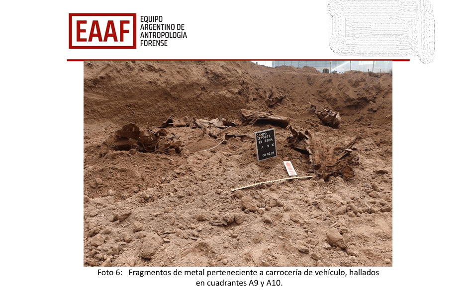 Desde la publicación de un primer informe de La Retaguardia durante el programa radial Oral Y Público, el jueves pasado por la noche, este medio dedicó parte importante de su esfuerzo a la reconstrucción de cada paso en los últimos meses en torno del hallazgo. Repasamos los datos que se saben. El descubrimiento de las partes del automóvil enterradas en la parcela A10 del Campo de deportes de la ESMA dataría de marzo de 2024. Al menos podemos asegurar que el 11 de ese mes el Equipo Argentino de Antropología Forense (EAAF), en su tercer informe sobre el predio presentado al juzgado interviniente, le dio la primera noticia: “A medida que avanzaron los trabajos de excavación, sobre el perfil norte de los cuadrantes A9 y A10, se registró a una profundidad aproximada de 1.10m el hallazgo de numerosos fragmentos de metal, correspondientes a la carrocería de un automóvil. Se efectuó un registro fotográfico del material descubierto y se procedió a su limpieza con el objeto de determinar posibles signos o evidencia de interés forense”. El informe del EAAF afirmaba también que “el estado de conservación de las autopartes recuperadas no permitió obtener información tendiente a la determinación de modelo, matrícula u otros datos de interés”.