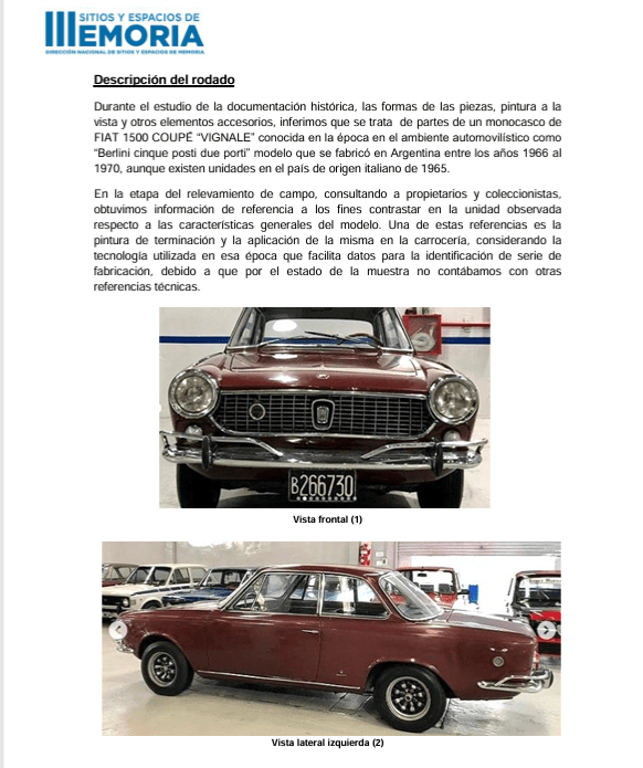 En el contrato entre las partes, hay un punto que podría haberse aplicado para frenar las obras en el momento del descubrimiento: “Déjese constancia de que, si a partir de la actuación del indicado organismo (por el EAAF), se produjere el hallazgo de algún elemento de interés para la investigación, se deberá dar inmediato aviso al tribunal, extremo que conllevará a la inmediata suspensión de la obra, hasta tanto el tribunal disponga expresamente su reanudación”. Sin embargo, las obras por parte de River Plate continuaron, porque en ese mismo informe de marzo, el Equipo advertía que “hasta el momento de la entrega del presente informe no se han producido hallazgos de interés forense”. Fin, diría el vocero candidato. Pero el tribunal no entendió lo mismo, porque dio intervención en septiembre a la División Automotor de la Policía Federal y al Equipo de Conservacion de la Dirección de Espacios y Sitios de Memoria. Ambos organismos establecieron que las partes corresponden a un Fiat 1500 Coupé (dos puertas) conocido entre fierreros como Vignale, fabricado en 1970. El color era Rojo Módena (en la denominación de la empresa italiana), como se advierte en las fotos entre el óxido.
