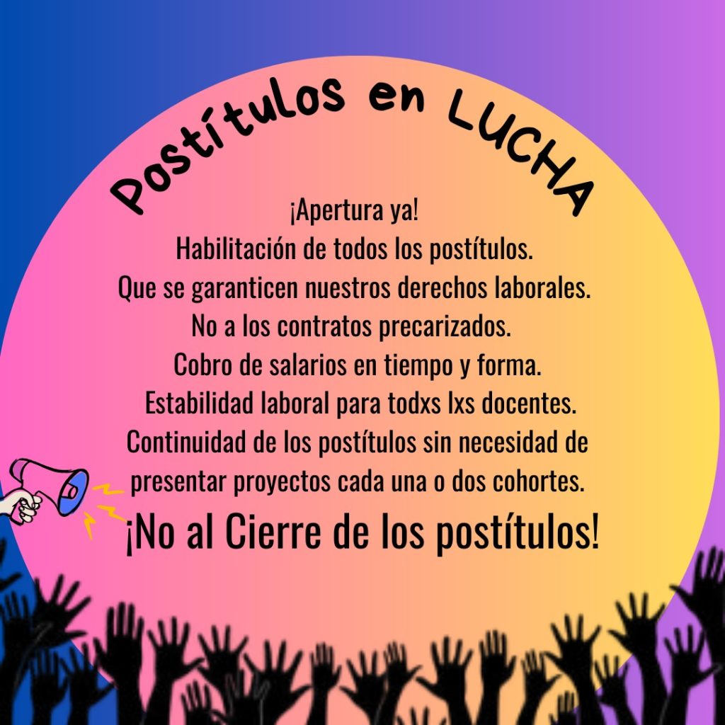 Desde @postítulosenlucha exigimos al Ministerio de Educación de la Ciudad de Buenos Aires: Habilitación de todos los postítulos. ¡Apertura ya! Que se garanticen nuestros derechos laborales. No a los contratos precarizados. Cobro de salarios en tiempo y forma. Estabilidad laboral para todxs lxs docentes. Continuidad de los postítulos sin necesidad de presentar proyectos cada una o dos cohortes. ¡No al Cierre de los postítulos!
