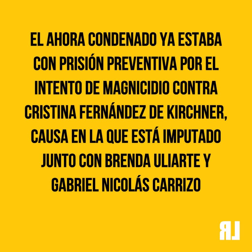El ahora condenado ya estaba con prisión preventiva por el intento de magnicidio contra Cristina Fernández de Kirchner, causa en la que está imputado junto con Brenda Uliarte y Gabriel Nicolás Carrizo. El juicio se lleva adelante todos los miércoles y se puede ver en el canal de YouTube de La Retaguardia.