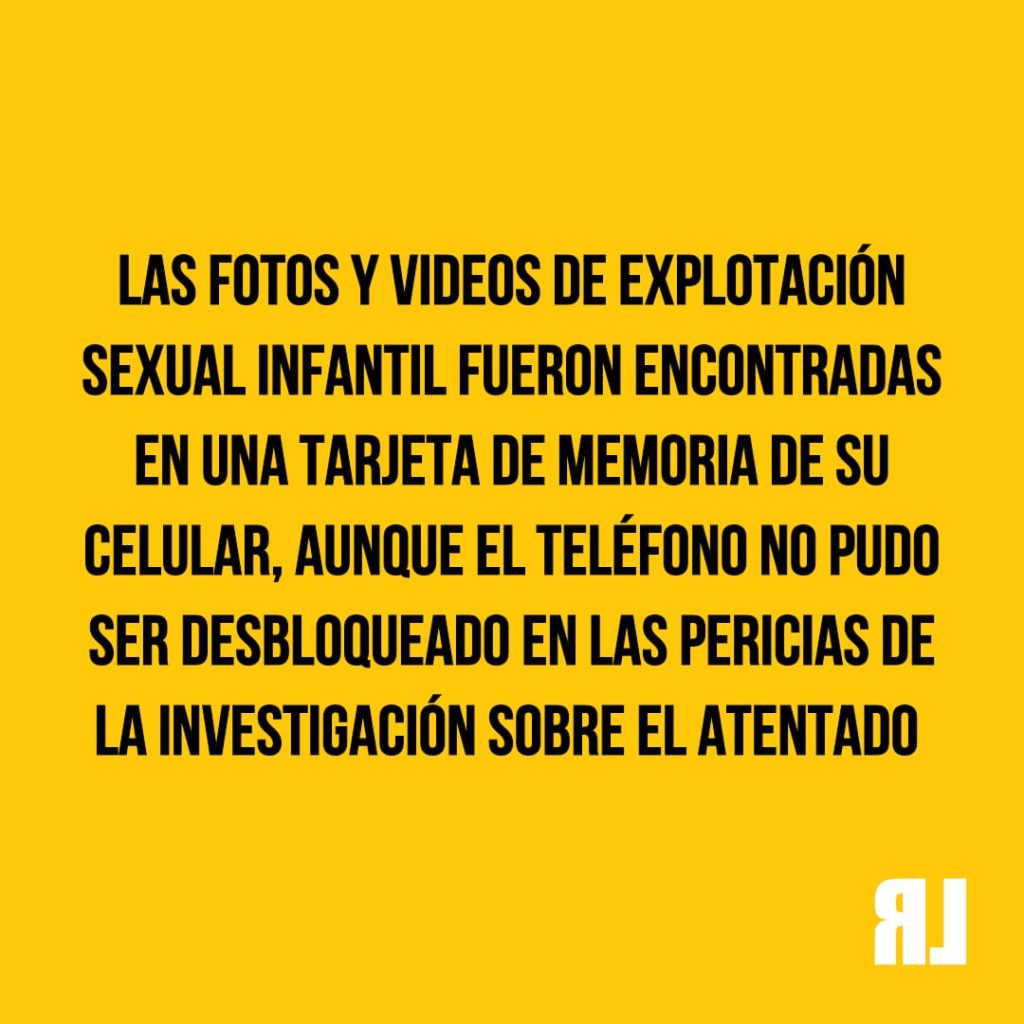 Las fotos y videos de explotación sexual infantil fueron encontradas en una tarjeta de memoria de su celular, aunque el teléfono no pudo ser desbloqueado en las pericias de la investigación sobre el atentado.
