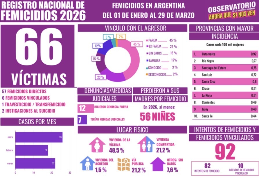 De acuerdo con el informe, entre el 1 de enero y el 29 de marzo se contabilizaron 66 víctimas fatales, de las cuales 57 fueron femicidios directos, 6 femicidios vinculados, 2 instigaciones al suicidio y 1 travesticidio o transfemicidio. La cifra equivale a 1 femicidio cada 33 horas.