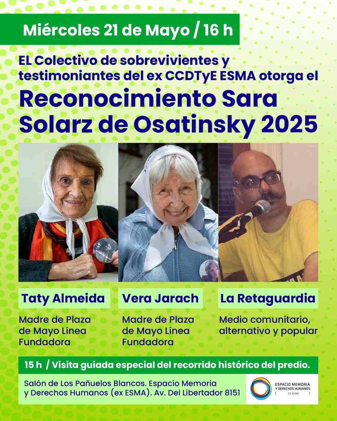 Queremos compartir con quienes nos acompañan que este abrazo nos emociona muy especialmente. Tenemos al menos tres razones para que así sea. La primera es que el reconocimiento lleva el nombre de Sara Solarz de Osatinsky. Ni más ni menos que una de las tres mujeres valientes (tiene que haber una palabra más justa para […]