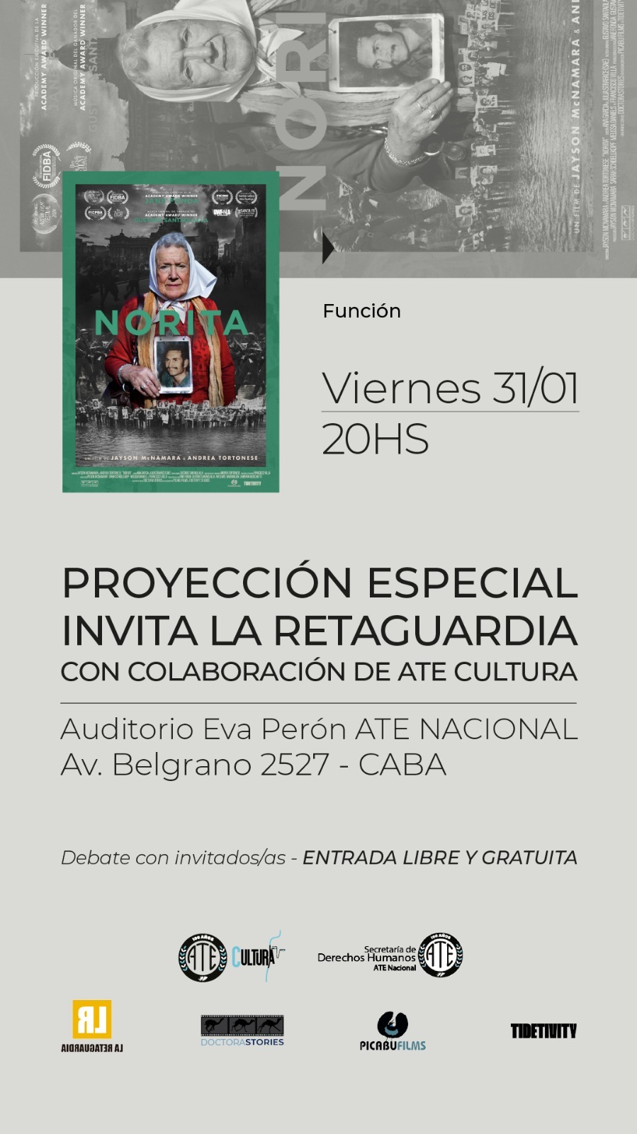 La Retaguardia, ATE Cultura Nacional, la dirección de Derechos Humanos de ATE Nacional y la producción de la película sobre la vida y las luchas de Nora Cortiñas, convocamos a una función especial. Será el viernes 31 de enero en el Auditorio Eva Perón de ATE. Como Norita planteaba para este tipo de proyecciones, luego […]